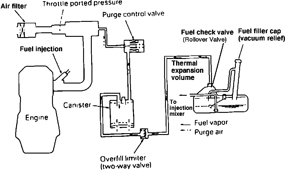 The Evaporative Emission Control System prevents fuel vapors entering the atmosphere. The Evaporative Emission Control System consists of a Pressure/Vacuum Relief Filler Cap, an Overfill Limiter (Two-way Valve), Rollover Safety Check Valves, a Charcoal Canister, and connecting lines and hoses. Canister purging is controlled by the Engine Control unit through the Purge Control Solenoid Valve.