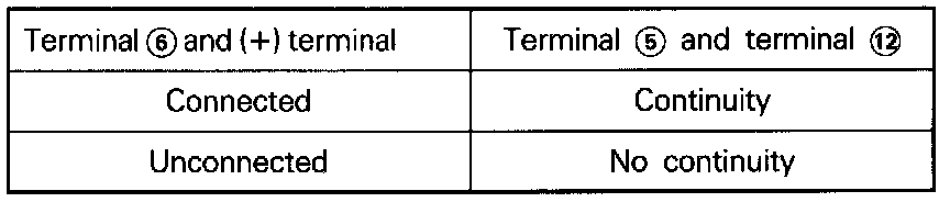 1. Connect the negative (-) terminal of the 1.5V power supply to terminal 5 of the [1][2]ignition power transistor; then check whether there is continuity between terminal 5 and terminal 12 when terminal 6 and the positive (+) terminal are connected and disconnected.