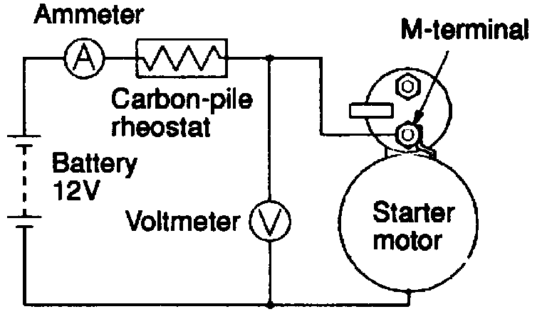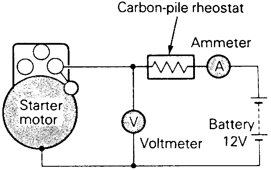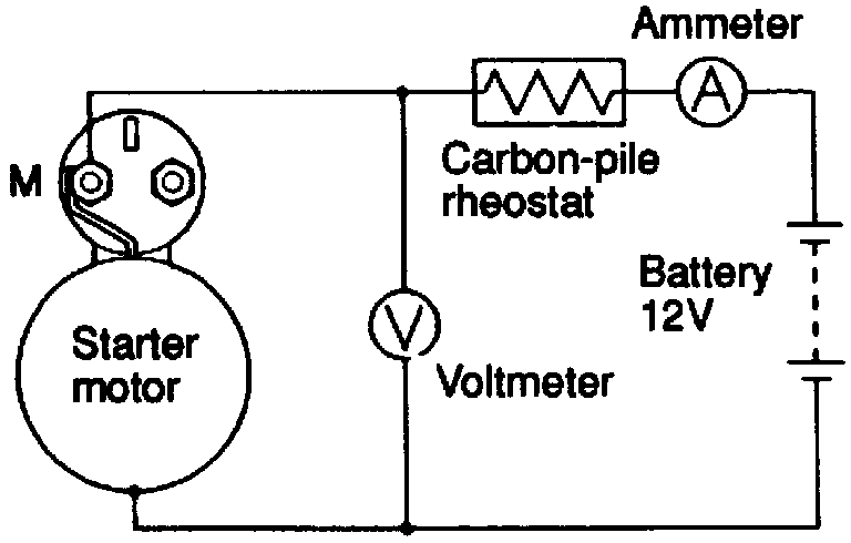 a. Connect a test voltmeter (100 ampere scale) and carbon pile rheostat in series with battery positive post and starter motor terminal.