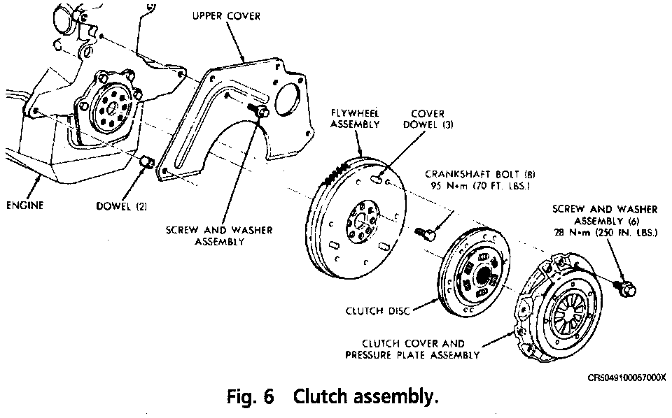 5. Reverse procedure to install. Align reference marks made during disassembly, then using a clutch disc alignment tool, install disc, plate and cover to flywheel.