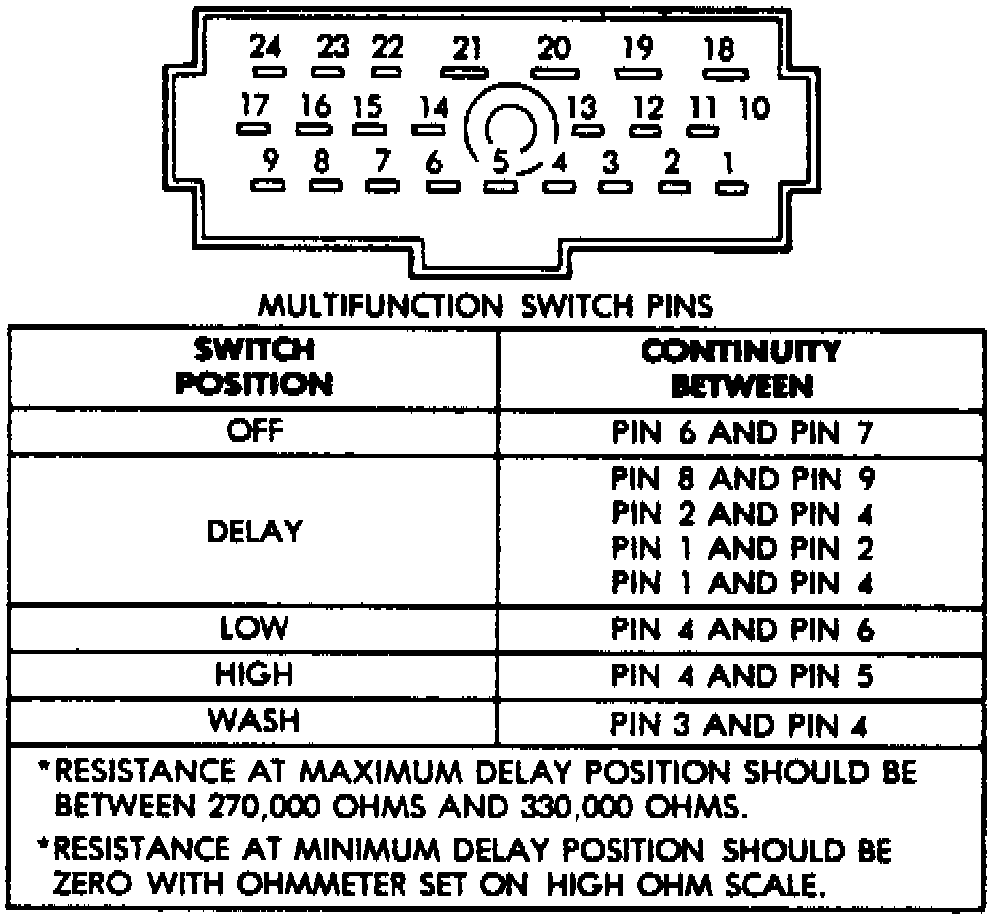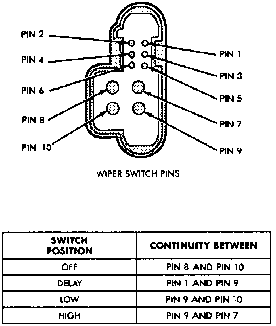 Disconnect wiper switch from body wiring harness in steering column. Test for continuity between terminals as shown.