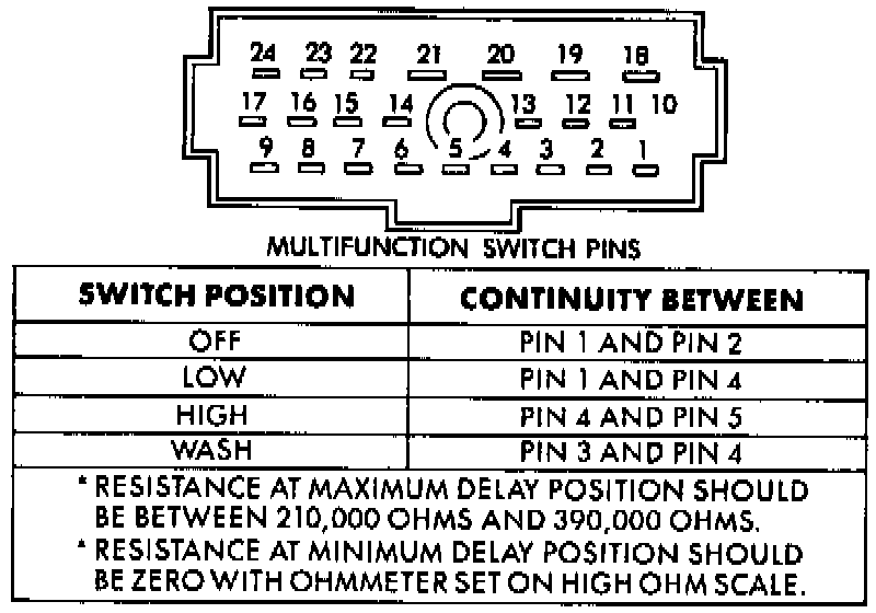 Disconnect wipe switch from body wiring harness in steering column. Test for continuity between terminals as shown.