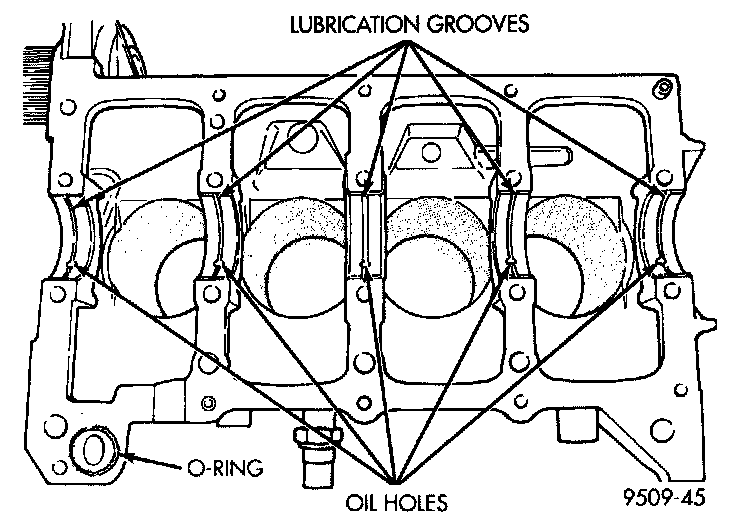 1. Install the main bearing shells with the lubrication groove in the cylinder block. Install 0-ring into recess in the block.