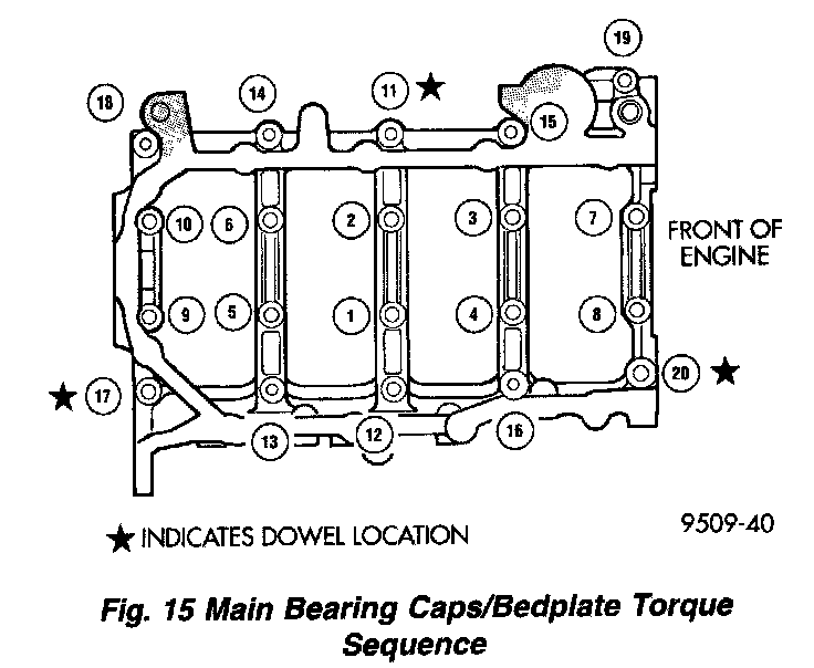 7. Install main bearing bedplate to engine block bolts 11, 17 and 20 finger tight. Tighten these bolts down together until the bedplate contacts the cylinder block. Then torque these bolts to 34 Nm (25 ft. lbs.).