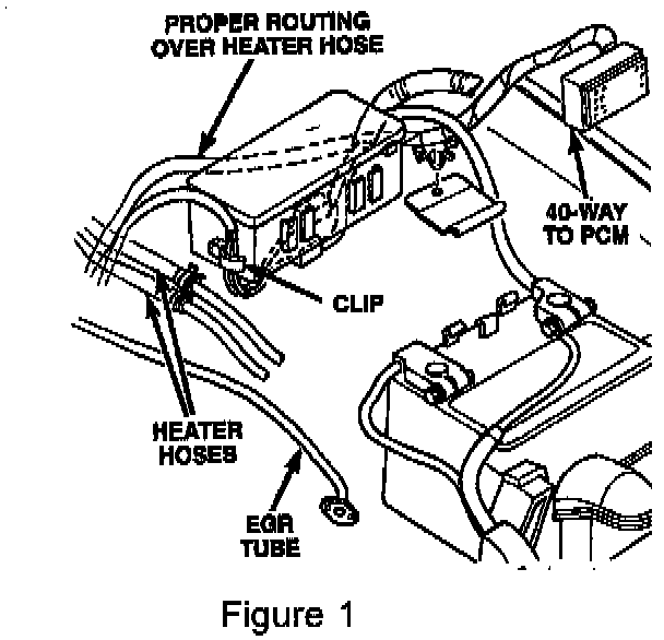 1. Open the hood and inspect the engine wiring harness take-outs to the 40-way connector on the PCM and the two 10-way connections at the PDC. The 10-way take-outs must route over the heater hoses and into the clip located on the inboard side of the PDC. The PCM 40-way take-out must route over the heater hoses with the locator snapped into the vehicle speed control bracket or transmission mount per Figure 1