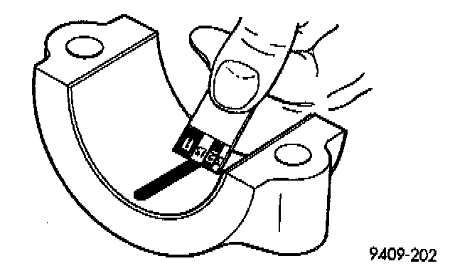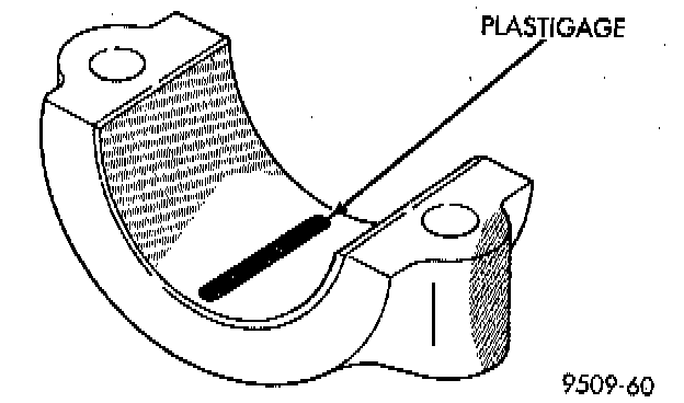 3. Place a piece of Plastigage across the entire width of the bearing shell in the bearing cap approximately 6.35 mm (1/4 inch) off center and away from the oil hole. In addition, suspect areas can be checked by placing plastigage in the suspect area.