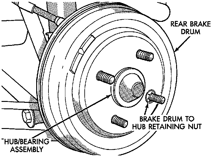 3. Remove rear brake drum to hub retaining clips (if equipped). Then remove rear brake drum from hub and bearing assembly.