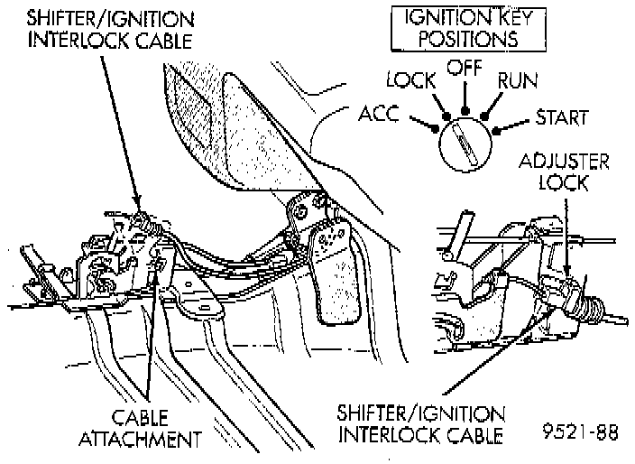 The Shifter/Ignition Interlock, is a mechanical cable operated system. It interconnects the automatic transmission floor-mounted shifter to the steering column ignition switch. The interlock system locks the floor-mounted shift lever into the PARK position whenever the ignition switch is in the LOCK or ACCESSORY position. When the key is in the OFF or RUN position, the shifter is unlocked and will move into any position. Also the interlock system prevents the ignition switch from being turned to LOCK or ACCESSORY position, unless shifter is in the PARK position.