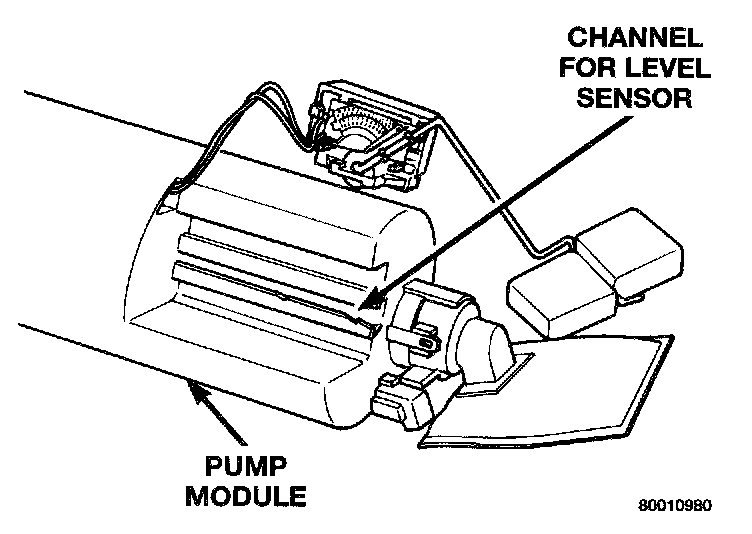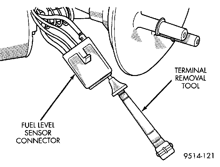 1. Depress retaining tab and remove the fuel pump/level sensor connector from the BOTTOM of the fuel pump module electrical connector.