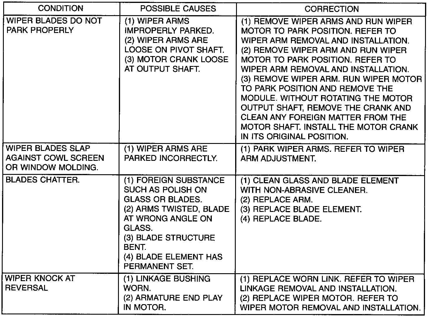 Whenever a wiper motor malfunction occurs, disconnect motor wire harness and clean the terminals. Ensure the wire harness is properly connected before starting diagnosis and repair procedures. Refer to Wiper Motor Test table.