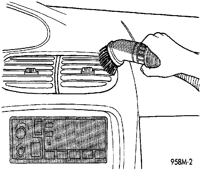 Use a vacuum cleaner to remove any residual powder from the vehicle interior. Work from the outside in to avoid kneeling or sitting in a contaminated area. Vacuum the heater and A/C outlets as well. If the heater or air conditioner was in RECIRC mode at time of airbag deployment, operate blower motor on low speed and vacuum powder residue expelled from the heater and A/C outlets. Multiple vacuum cleaning may to necessary to decontaminate the interior of the vehicle.