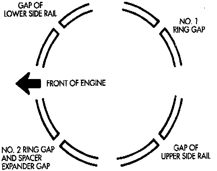 6. Position oil ring expander gap at least 45° from the side rail gaps but not on the piston pin center or on the thrust direction. Staggering ring gap is important for oil control.