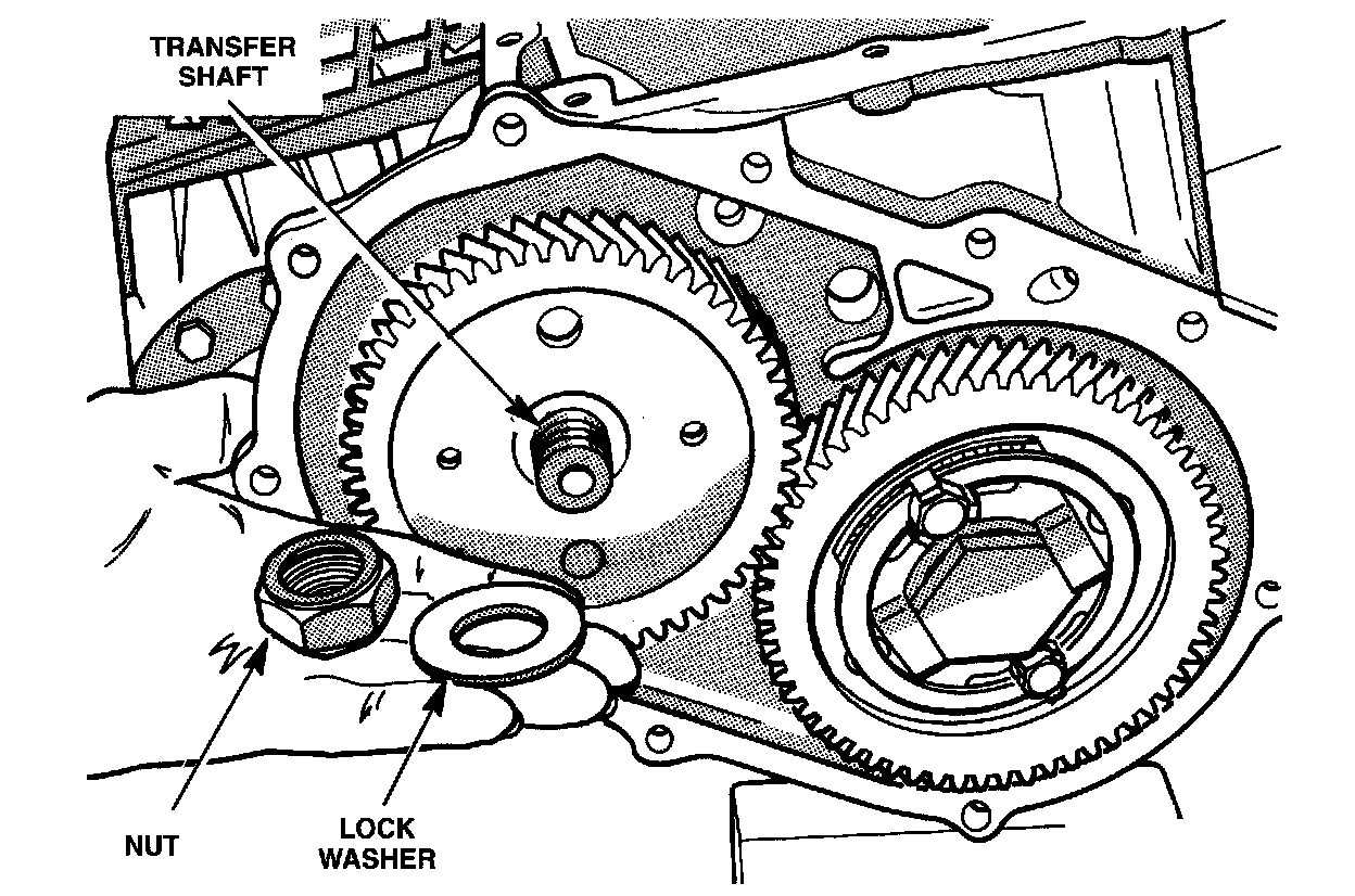 The 41TE transaxle uses a transfer system to transfer power from the output shaft of the rear carrier to the transfer shaft. The gear splined and bolted to the output shaft of the rear carrier is called the output shaft transfer gear. It supplies power to the transfer shaft transfer gear, which is splined to the transfer shaft and retained by a large nut. The bolt and nut that retain the transfer gears to each shaft must be tightened to the proper torque specification. Proper torque is essential for two reasons: to keep the gears on the shafts and to maintain the bearing settings.
