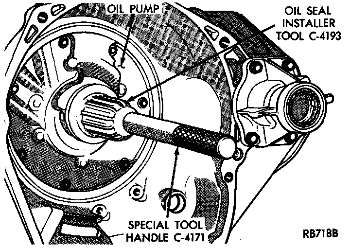 To install a new seal, place seal in opening of the pump housing (lip side facing inward). Using Tool C-4193 and Handle Tool C-4171, drive new seal into housing until tool bottoms.