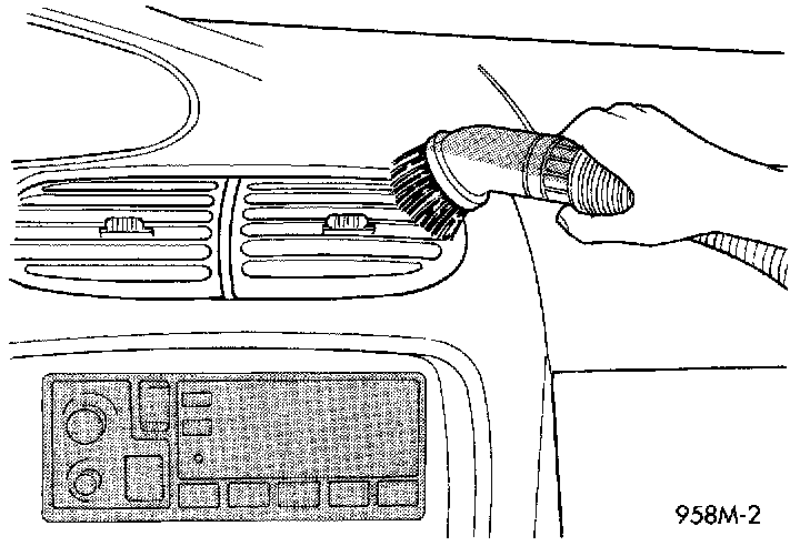 Use a vacuum cleaner to remove any residual powder from the vehicle interior. Work from the outside in to avoid kneeling or sitting in a contaminated area. Vacuum the heater and A/C outlets as well. If the heater or air conditioner was in RECIRC mode at time of airbag deployment, operate blower motor on low speed and vacuum powder residue expelled from the heater and A/C outlets. Multiple vacuum cleaning may to necessary to decontaminate the interior of the vehicle.