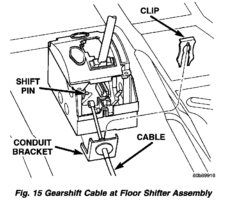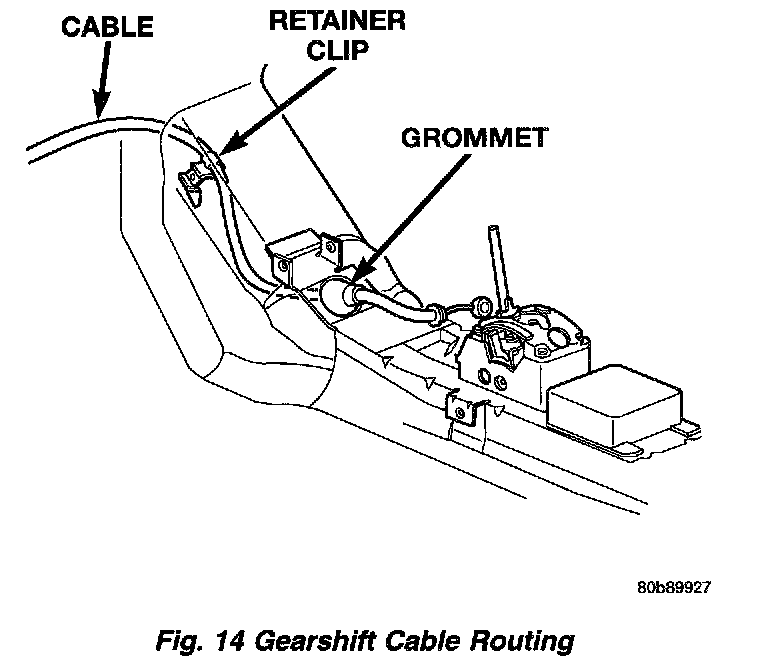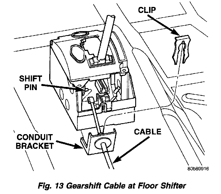 6. Connect cable to shifter conduit bracket and shift pin. Install cable retaining clip (Fig. 13).