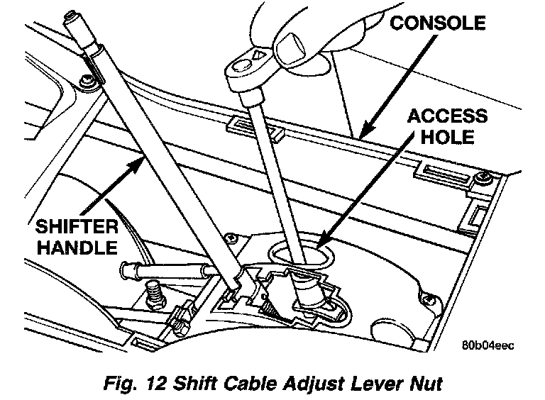 12. Loosen nut on shift cable adjust lever (Fig. 12).