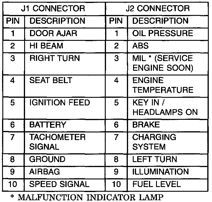 2. Check for ignition voltage at Pin J1-5 of the cluster wire harness connector. Check for battery voltage at Pin J1-6 of the connector. If no voltage, repair as necessary.