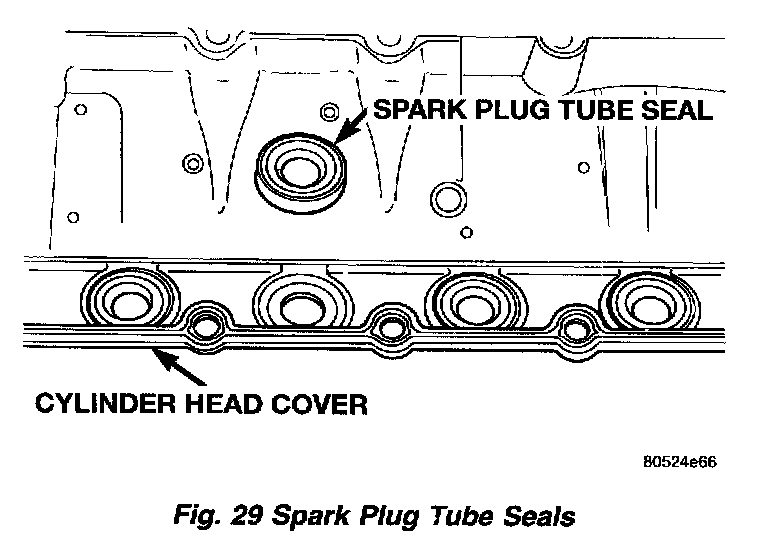 The spark plug tube seals are located in the cylinder head cover (Fig. 29). These seals are pressed into the cylinder head cover to seal the outside perimeter of the spark plug tubes. If these seals show signs of hardness and/or cracking they should be replaced.