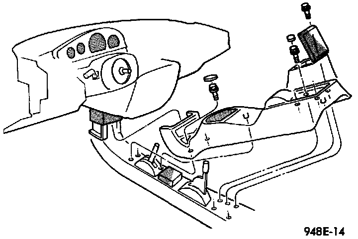 2. Remove the attaching screw from each of the two forward cup holders of the floor console. Remove the screws at the rear of the console or inside of the armrest console bin.