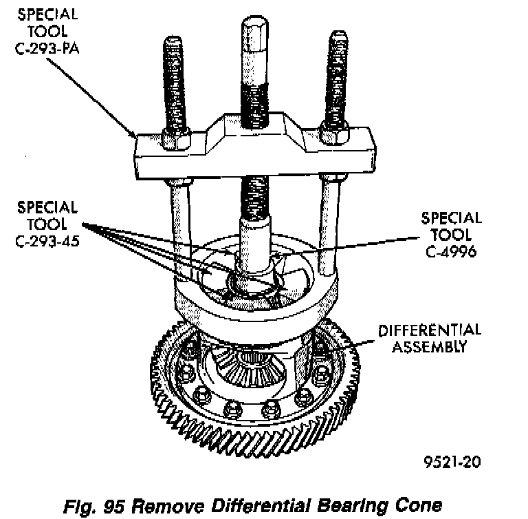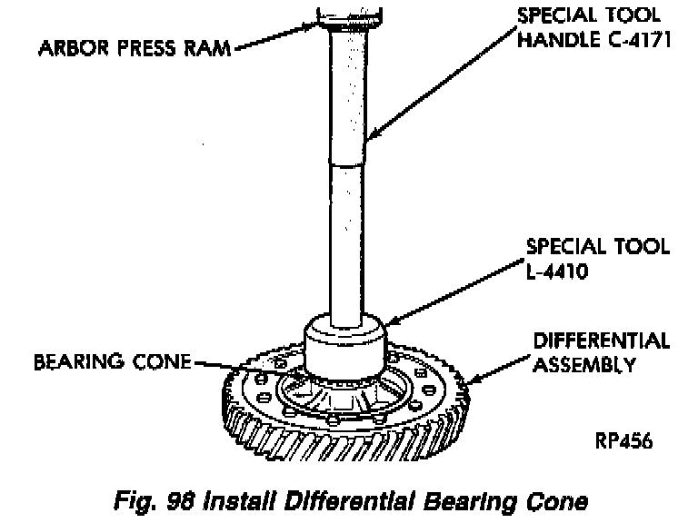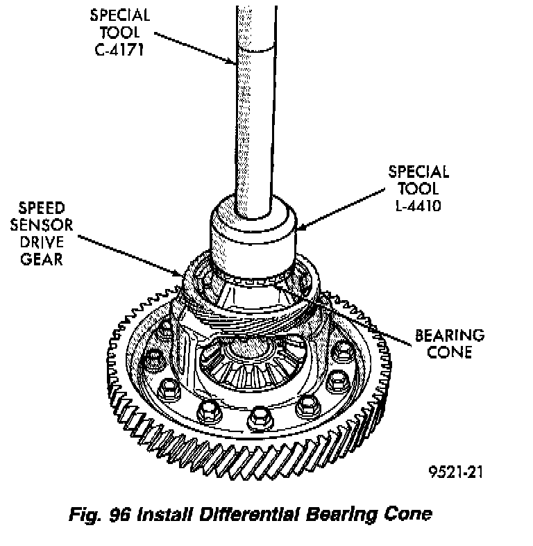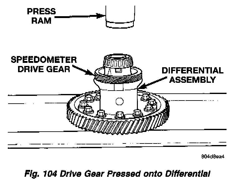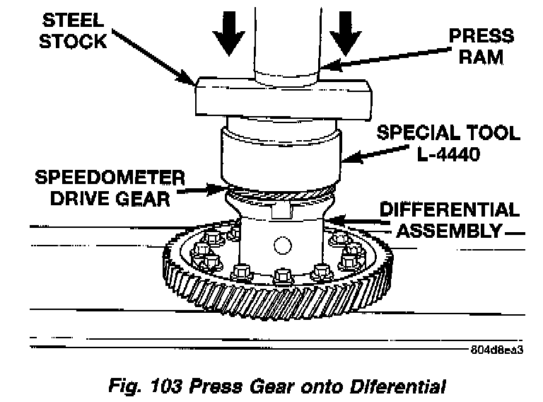 2. Using Miller Tool # L-4440 and steel stock, press speedometer drive gear onto differential. Do not use a hammer.