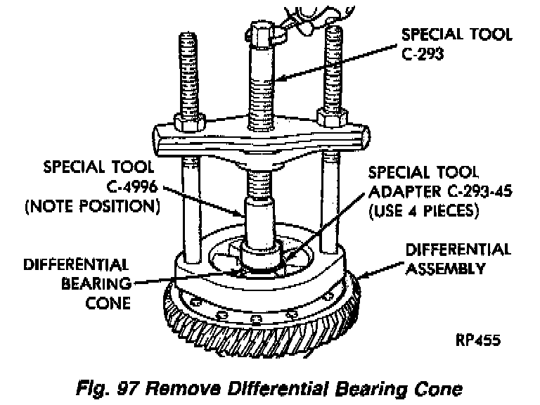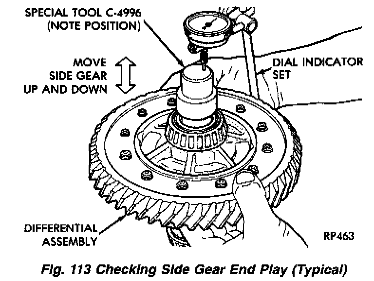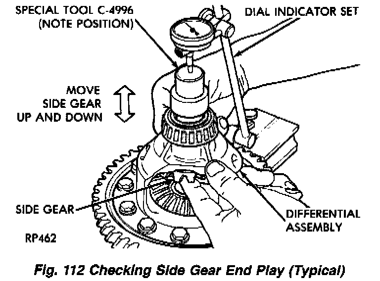 6. Using the smallest end play recorded, shim that side gear to within 0.001 to 0.013 inch. The other side gear should be checked using the same procedure.