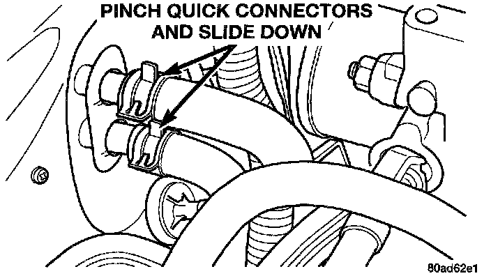 NOTE: The heater hoses used are preformed hoses with quick connect fittings at the engine. These hoses are not serviceable and must be replaced using OEM parts. The hoses are attached at the heater core using spring tension clamps.