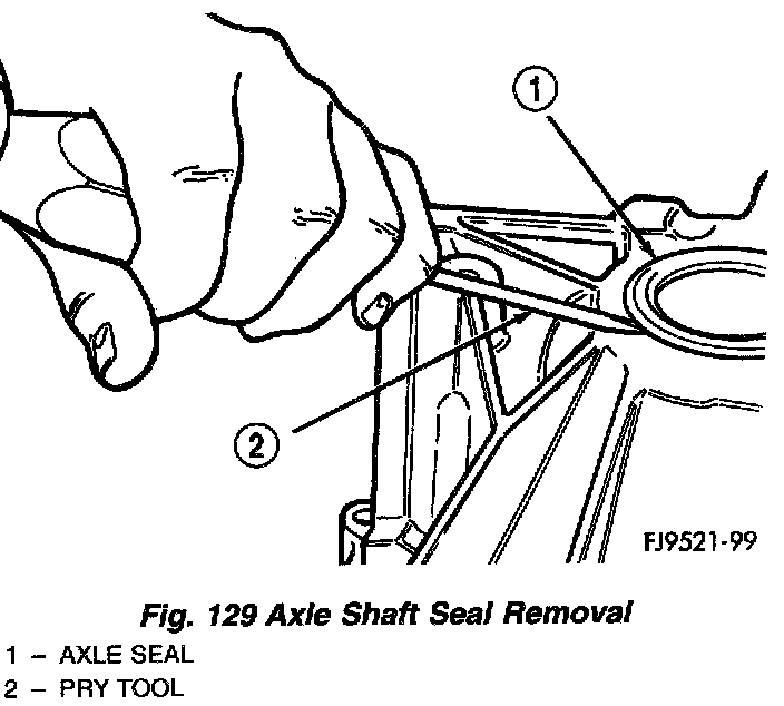 1. Insert a flat-blade pry tool at outer edge of axle shaft seal (Fig. 129).