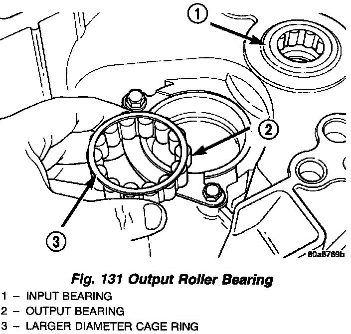 1. Remove caged roller bearing from output bearing race (Fig. 131).