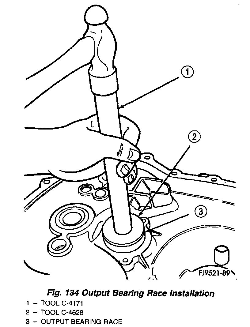 2. Insert tool #4628 with C-4171 into output bearing race (Fig. 134). Tap race into bore. Install output bearing into race. Verify that the larger diameter cage is facing outward. Position bearing retaining strap. Tighten bolts to 11 Nm (96 inch lbs.).