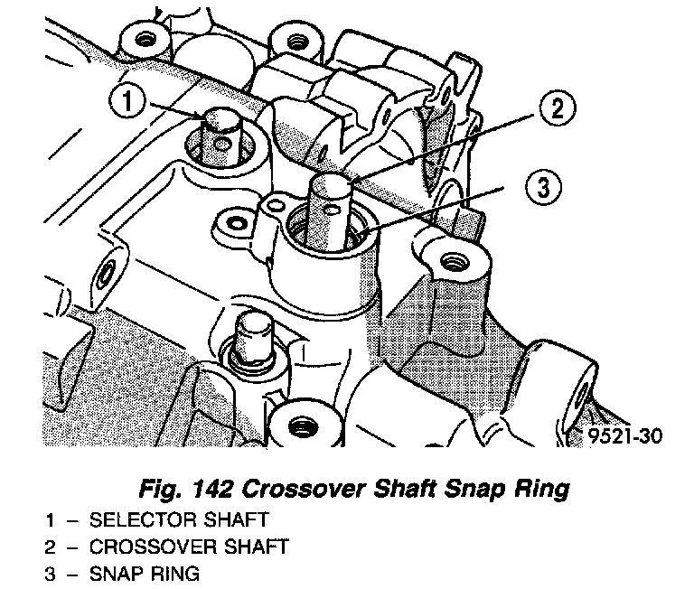 3. Using snap-ring pliers, remove the snap ring at the crossover shaft bore (Fig. 142).