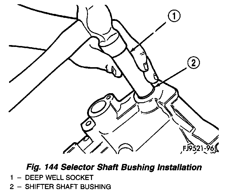 2. Using an appropriate size deep-well socket, install bushing in selector shaft bore (Fig. 144).