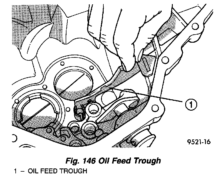 The bearing oil feed trough is retained in the case by a pin that is molded into the case and clips that are part of the trough (Fig. 146).