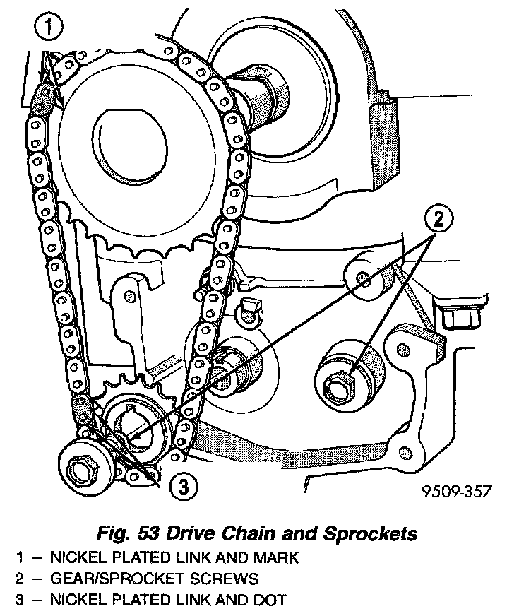 4. Remove balance shaft gear, chain sprocket retaining screws, and crankshaft chain sprocket. Remove chain and sprocket assembly (Fig. 53). Using two wide pry bars, work the sprocket back and forth until it is off the shaft.