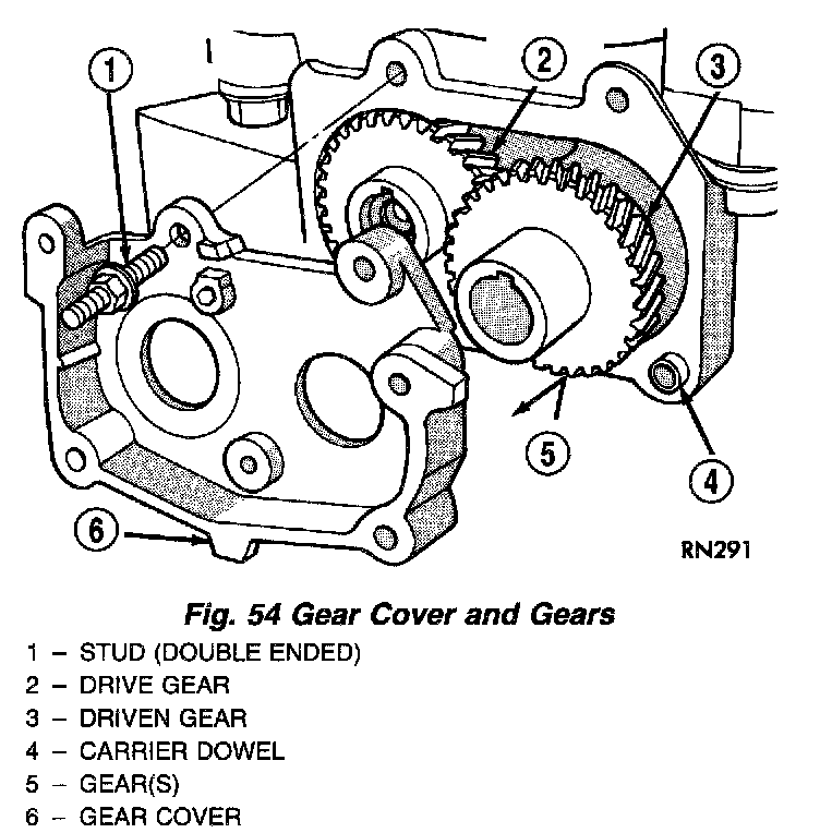 The following components will remain intact during carrier removal. Gear cover, gears, balance shafts and the rear cover (Fig. 55).