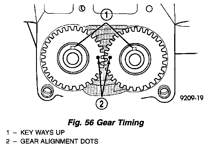 2. Turn balance shafts until both shaft key ways are up Parallel to vertical centerline of engine. Install short hub drive gear on sprocket driven shaft and long hub gear on gear driven shaft. After installation gear and balance shaft keyways must be up with gear timing marks meshed as shown in image (Fig. 56).