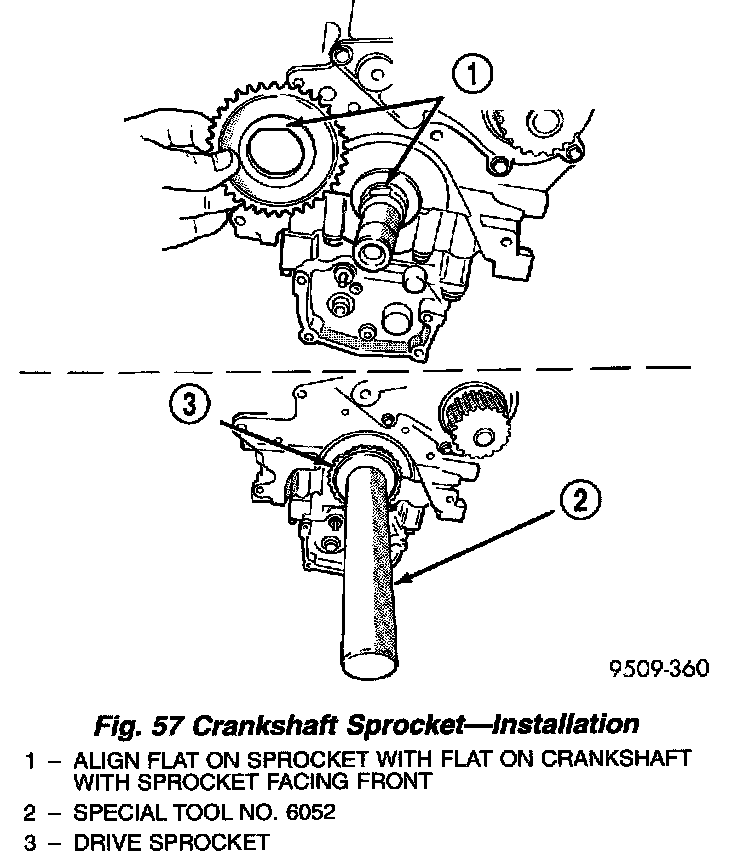 4. Install crankshaft sprocket using Special Tool 6052 (Fig. 57).
