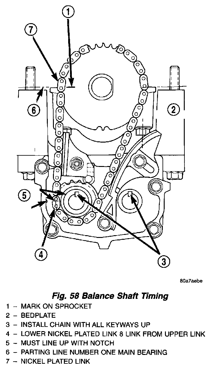 5. Turn crankshaft until number one cylinder is at Top Dead Center (TDC). The timing marks on the chain sprocket should line up with the parting line on the left side of number one main bearing cap (Fig. 58).