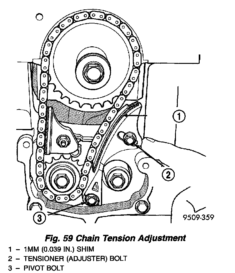c. Place a shim 1 mm (0.039 inch) thick x 70 mm (2.75 inch) long or between tensioner and chain. Push tensioner and shim up against the chain. Apply firm pressure (5.5 to 6.6 lbs.) directly behind the adjustment slot to take up all slack. Chain must have shoe radius contact as shown in (Fig. 59).