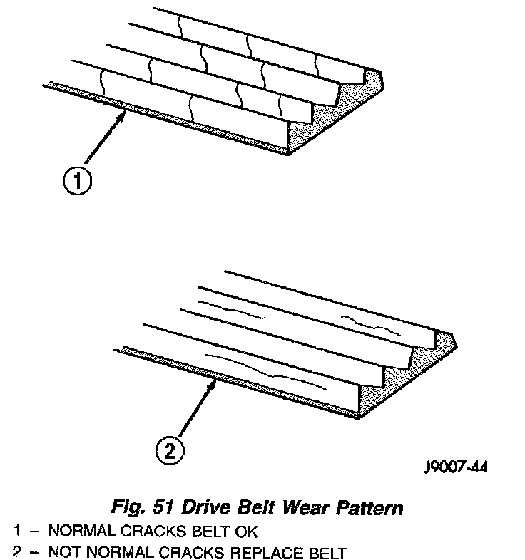 Poly-V Belt system may develop minor cracks across the ribbed side. These minor cracks are considered normal and acceptable. Cracks parallel are not (Fig. 51).