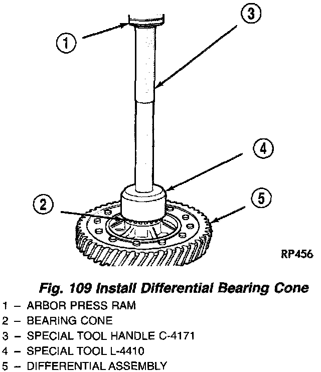 2. Using Miller Tool # L-4440 and steel stock, press speedometer drive gear onto differential (Fig. 114) (Fig. 115). Do not use a hammer.