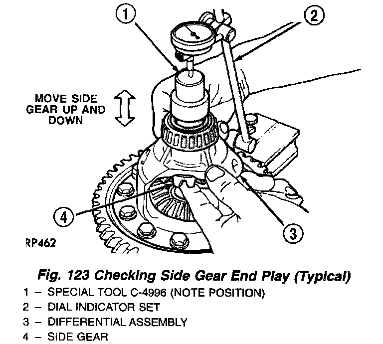 4. Set up dial indicator as shown and record end play (Fig. 123) (Fig. 124). Rotate side gear 90 degrees and record another end play. Again, rotate side gear 90 degrees and record a final end play.