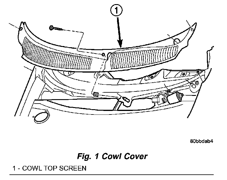 3. Remove the five screws holding cowl cover to cowl at base of windshield opening (Fig. 1).