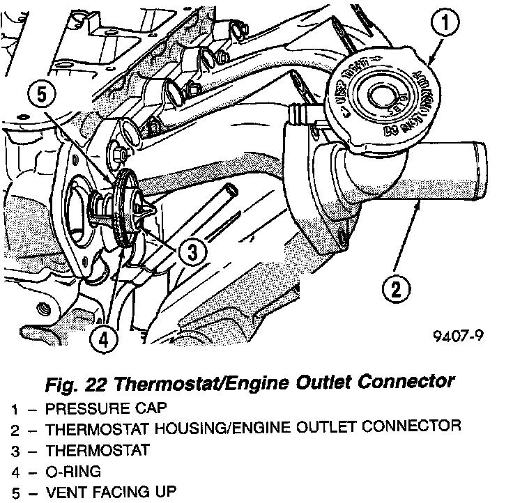2. Place the new thermostat assembly into the thermostat housing/outlet connector. Align vent with notch in cylinder head.
