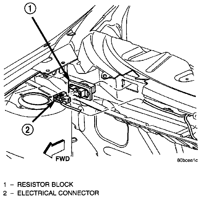 CAUTION: Stay clear of the blower motor and resistor block (Hot). Do not operate the blower motor with the resistor block removed.REMOVAL