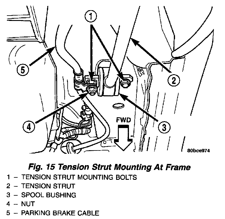5. Remove the two mounting bolts holding the tension bolts to the frame, then remove the tension strut from the vehicle.