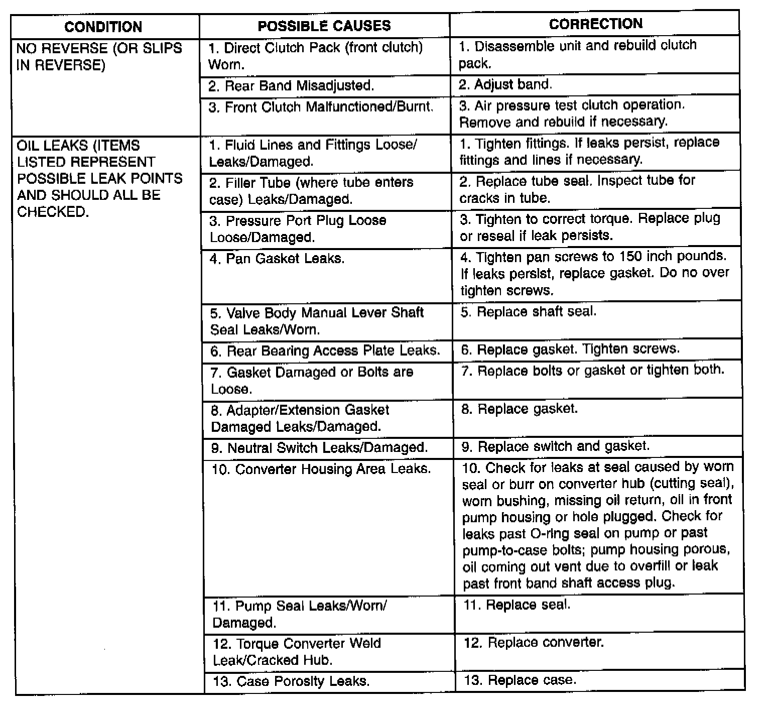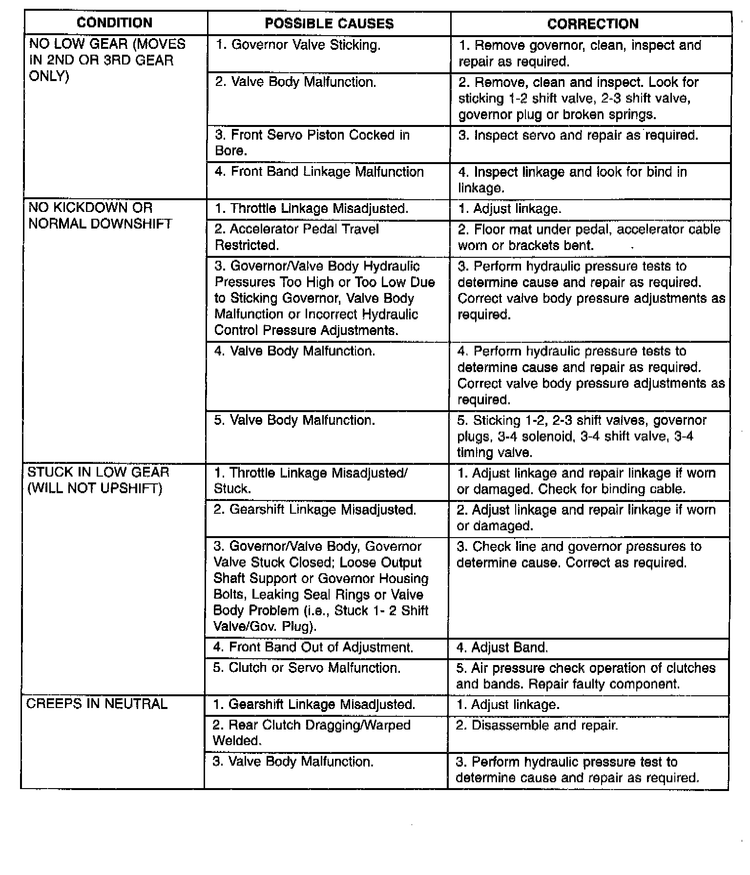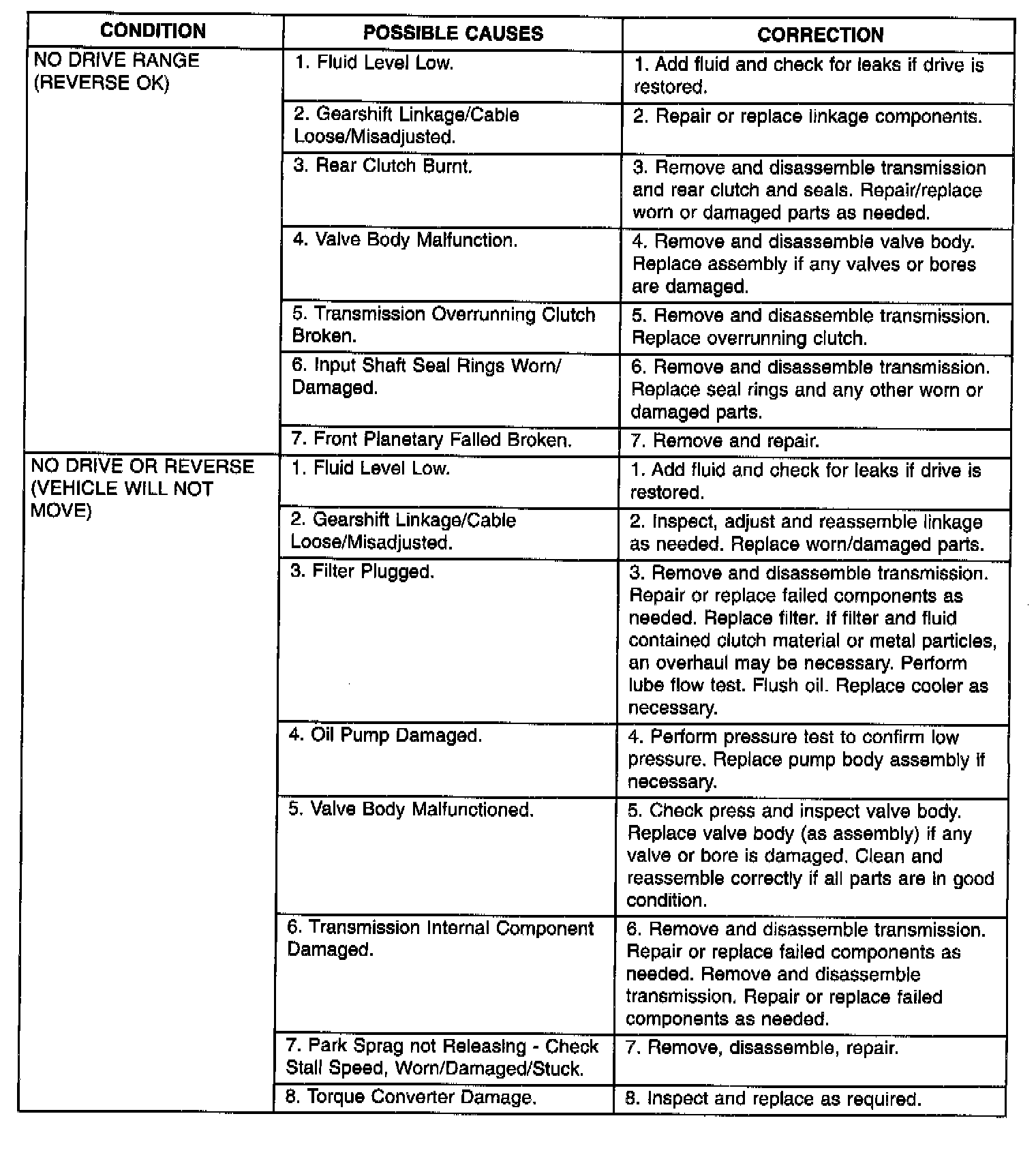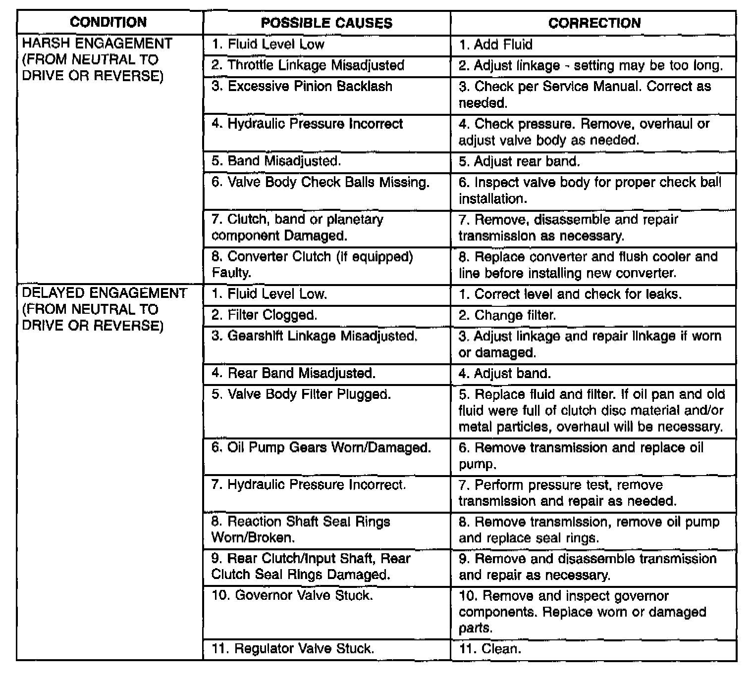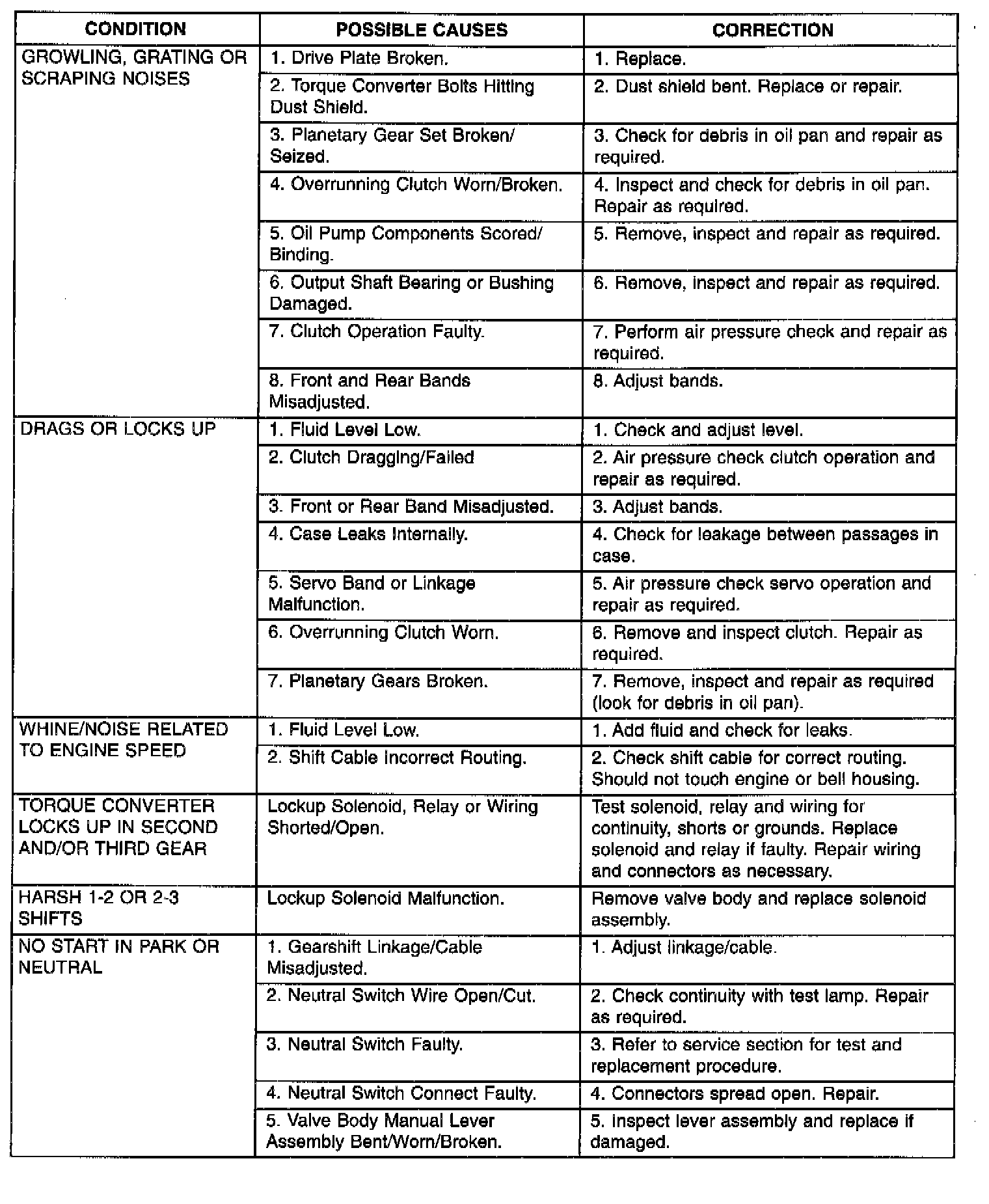 Automatic transaxle malfunctions are usually caused by the following general conditions:- Improper fluid level/condition