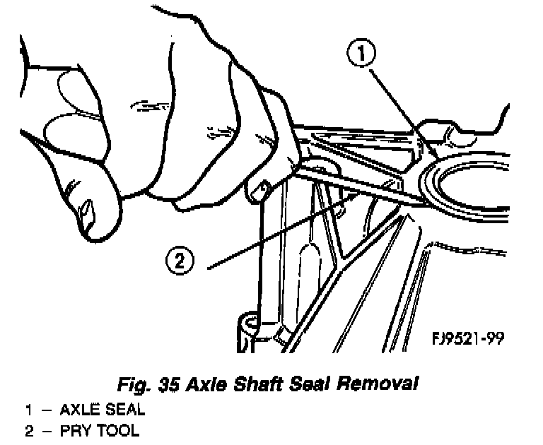 2. Insert a flat-blade pry tool at outer edge of axle shaft seal (Fig. 35).