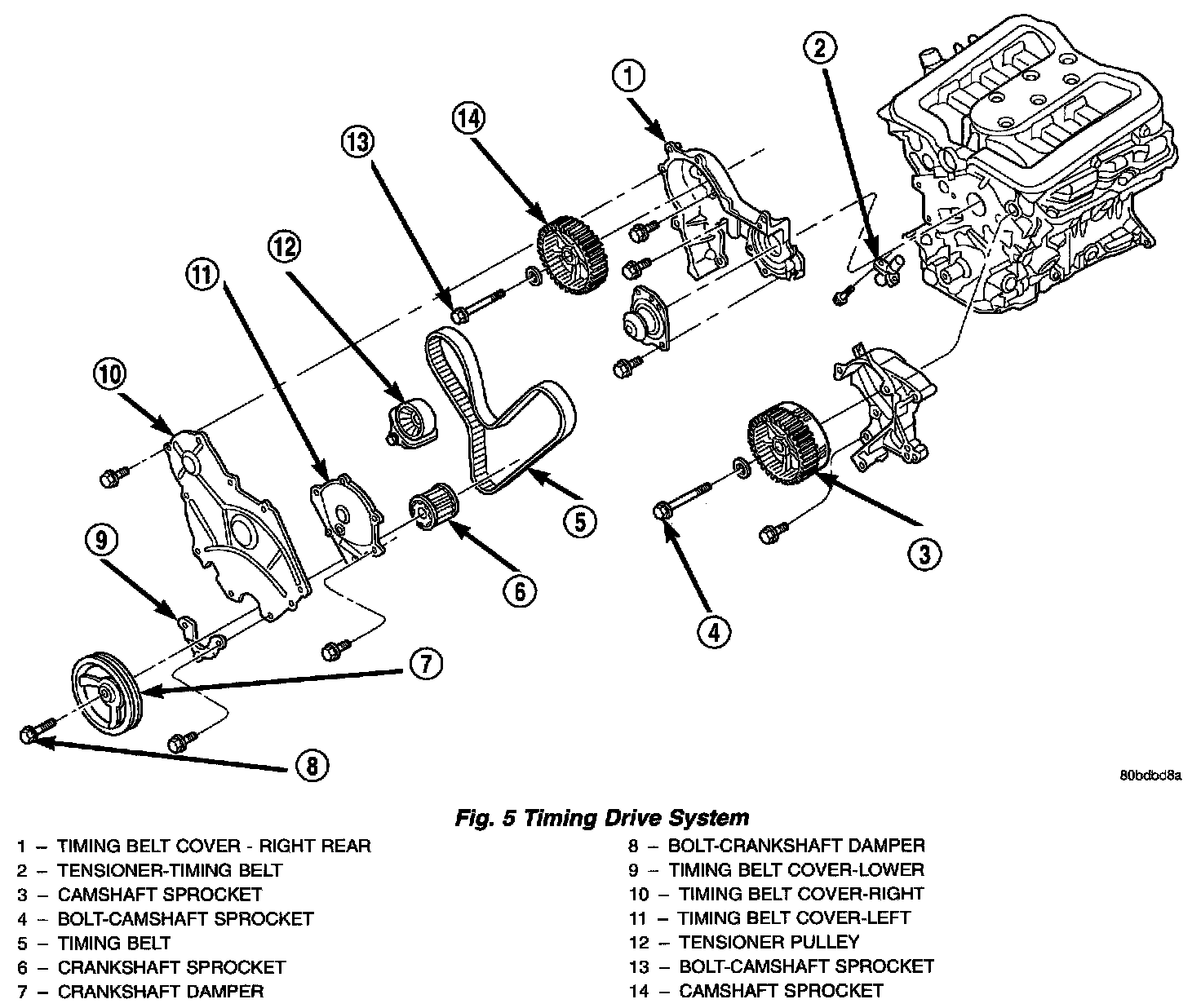 The timing drive components include a crankshaft sprocket, camshaft sprockets, tensioner pulley, hydraulic tensioner and a timing belt. The water pump is driven by the back side of the timing belt. The right and left camshaft sprockets are not interchangeable because of the cam sensor pick-up wheel on the left sprocket.