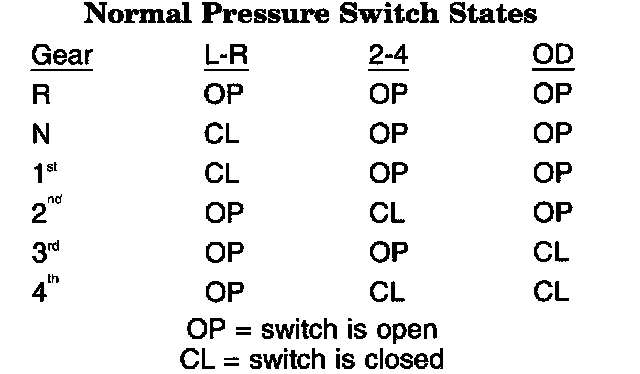 Immediately after a controller reset (ignition key turned to the "run" position or after cranking engine), the TCM verifies that the relay contacts are open by checking for no voltage at the switched battery terminals. After this is verified, the voltage at the solenoid pack pressure switches is checked. There should be no voltage on the pressure switches at this time. The TCM will then activate the relay.